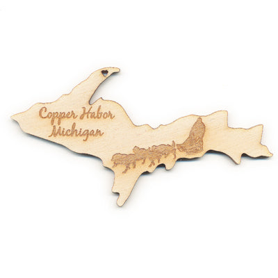 This 3-inch magnet, crafted from Baltic birch, features the distinctive Upper Peninsula (UP) shape with an intricate dog sled design. Its durable construction provides strong magnetic hold, making it a functional and decorative piece for any metal surface. Ideal for those who appreciate regional craftsmanship and winter sports motifs.