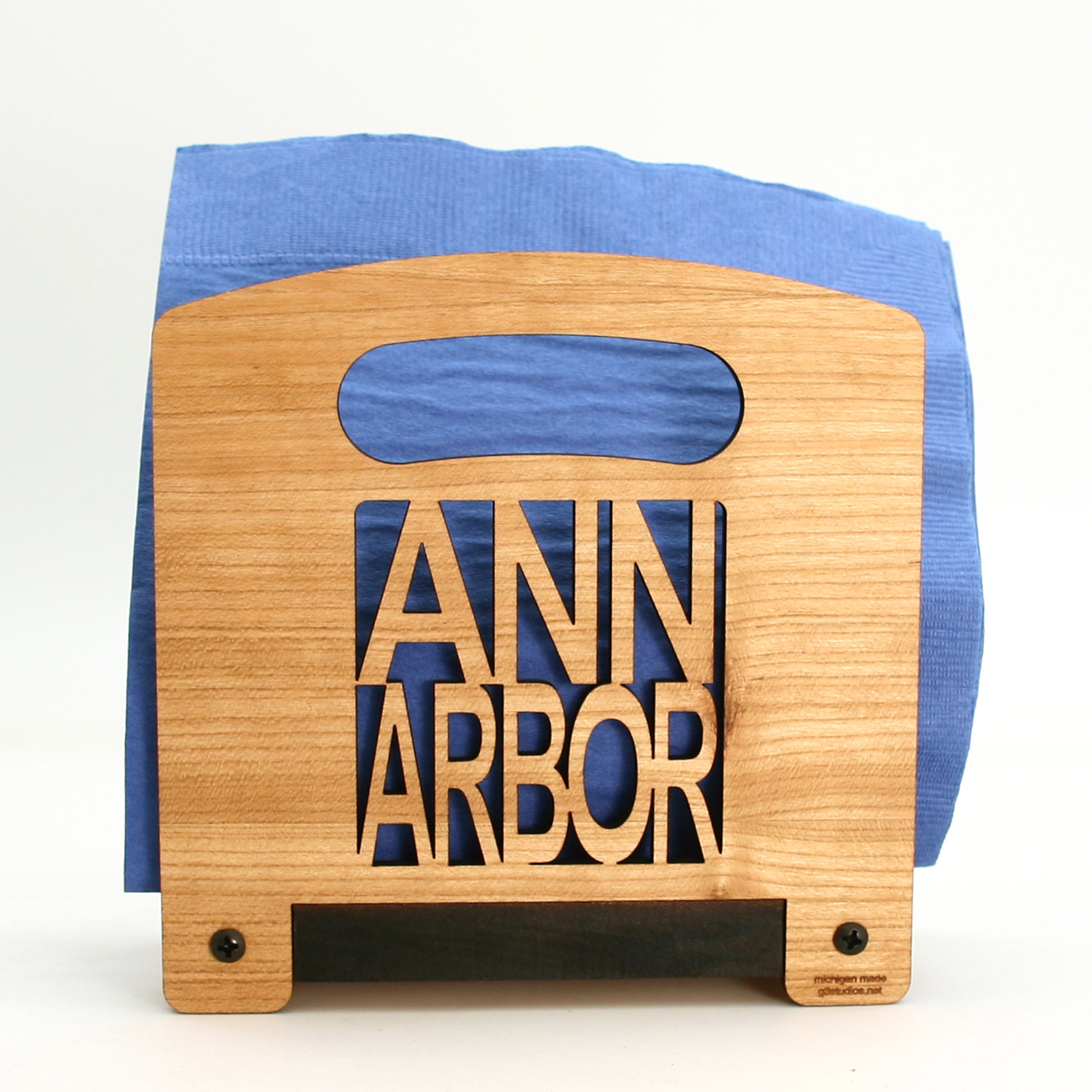 Add a touch of Ann Arbor charm to your dining with this handcrafted cherry napkin holder. Built with solid cherry wood bottom and cherry MDF sides, finished with natural oils for durability and a lasting finish.