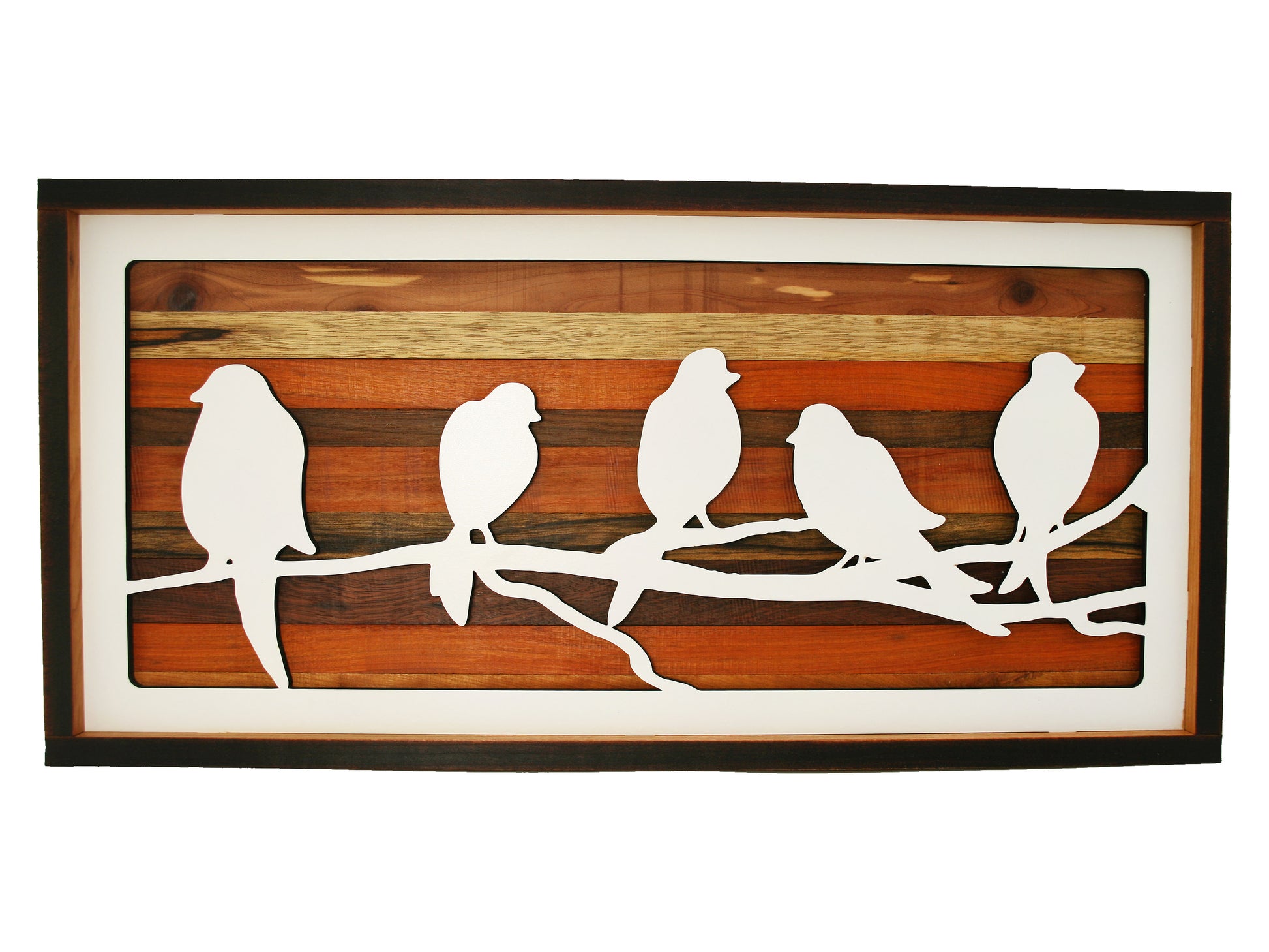 Bring the outdoors in with this stunning handcrafted wood wall art featuring birds perched on a branch. Each piece is carefully hand-pieced and set against a backdrop of colorful exotic hardwoods, creating a bold, natural statement piece.